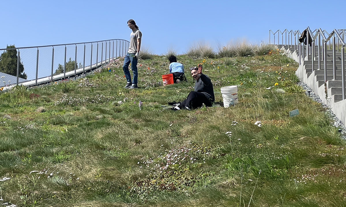 After extensive research and consultation with multiple professionals, including green roof specialists, soil experts, botanists, ecologists, and naturalists, it was decided to convert the roof into California Meadow habitat. The first step of the restoration project was purchasing and distributing special green roof soil made with volcanic pumice. Irrigation and fertilization schedules, carefully optimized to support the plants, were also created and implemented. “When you plant grasses and flowering plants very closely together,” said Kuzmenko, “they support each other… [and] make a thick cover on the roof.” Not only is it a healthier ecosystem, but it is also one which, by all accounts, is far more aesthetically pleasing than the original succulents. Wright expressed satisfaction with the outcome of their hard work. “You can’t look barely a square foot without seeing some plant that’s part of our effort.”